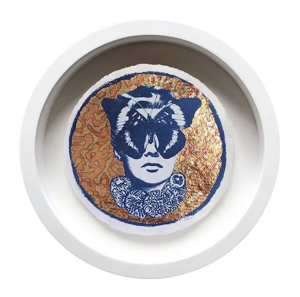 Chloe works with cyanotype, a method of alternative photography that allows replicating images with an analogue process. The subjects of her work are inspiring women from history including Mary Shelley, Marie Curie and Amelia Earhart amongst others. The portraits are the basis of a collage process following intensive research and studying the lives and contributions of the women figures. To this she often adds metallic leaf such as zinc, copper or gold leaf.