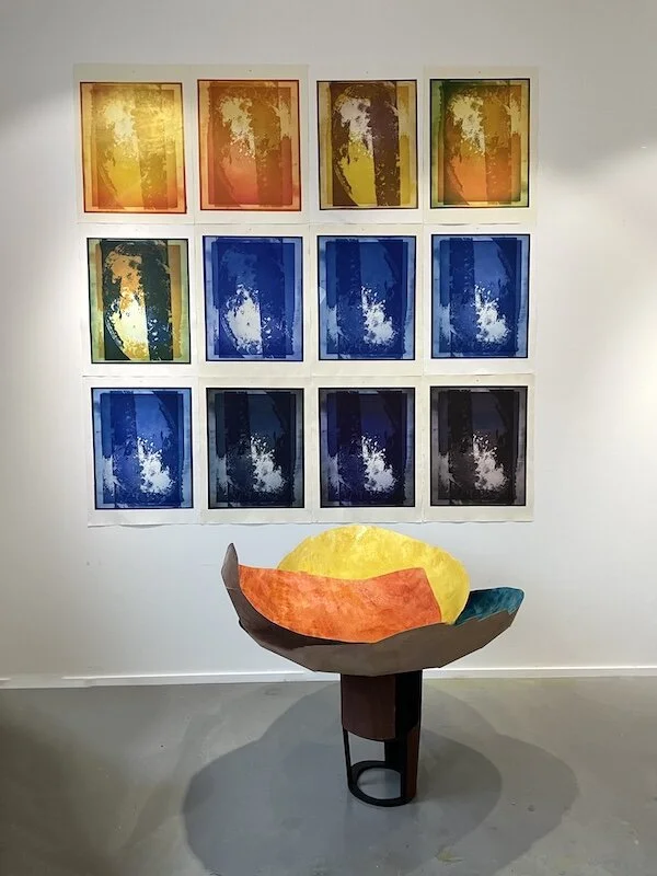 I’ve developed a way to work with several materials at the same time, incorporating research along the way, so I can’t quite track where the beginning or end really is. I allow the processes to feed into each other through the changing chance of how they are being made. For example, in the morning I will work on a cast glass maquette informed by some sketchy collages I’ve made the evening before, and in the afternoon I’ll carry imagery and experience from that process into the etching studio where I reproduce this experience by enlarging interesting sections and shapes I’ve discovered. At the same time, I’ll have a few canvases on the go, and keep adding fine layers. It’s like juggling. It is also a fluid and open way to let things happen, rather than being overly controlling. I like to use many means to represent impressions of earthly journeys, so I’m tuned in to crush, print, collage, paint or carve material to see what it can do.