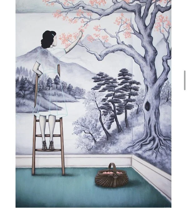 Before I began exploring narrative work, I was all over the place trying to find the visual vehicle for what I wanted to say, there are even a few alien paintings in there and a whole series I did using hands! But even in college, I painted these small character narrative paintings about my Grandma who was suffering from Alzhiemers at the time. Those paintings way back then were just a thread of my truth that was starting to peek in the door. I wasn't ready to paint that way again until I had lived a little longer, been through experiences in life and learned more visual skills to create the work. I think we all have ideas and a style we're not ready for just yet and if we can keep pressing into that making place, trying new things, living and learning...eventually we will be ready to create what we were meant to make. I wasn't ready to pursue art as a career back in college. It took me coming to a place in my life where I needed to create to survive emotionally and spiritually. Themes of a character, family, home, all with a narrative and vintage feel...those things were always there waiting for me to pull the threads and jump down the rabbit hole. Once my kids came and we were reading all the time with them, it awakened something in me. Like an itch I didn't realize I had. I was suddenly filled with stories. I adore vintage photography so I pulled that thread and wondered what if I put these characters in my own world. The sky opened and it hasn't closed. Vintage Hollywood Glamour photos are still something I love to reference in my patterned portraits. Vintage photographs led to a fascination with vintage wallpaper, fabrics and landscapes. I continue to pull the threads of interest in my life, exploring chameleonic behavior in my work is the most recent direction I've been taking.