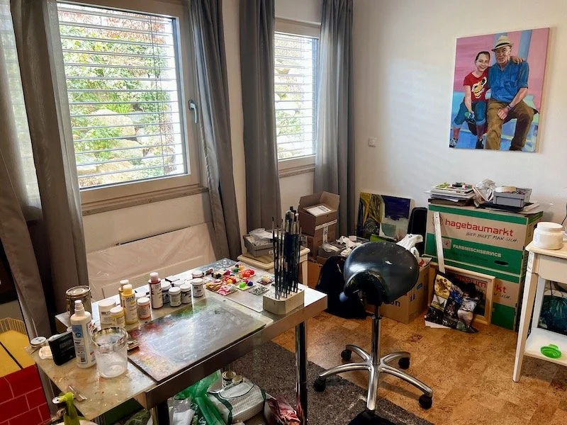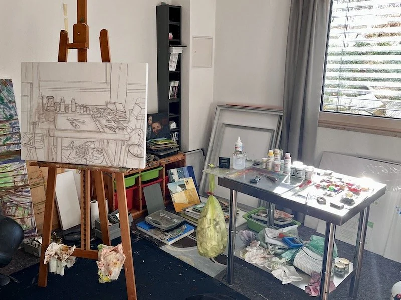 He shares “My studio is a compact and well-lit space where everyday tools, colors, and materials form a visual system of their own. The worktable, with its pigments, mediums, and organized clutter, becomes both a practical center and a recurring motif. I often observe how these small constellations of color and order shape my painterly thinking. In my practice, painting is not only a means of interpreting the external world, but also of observing my surroundings through painterly reflection. I sometimes paint the studio itself, transforming a utilitarian scene into a quiet composition.